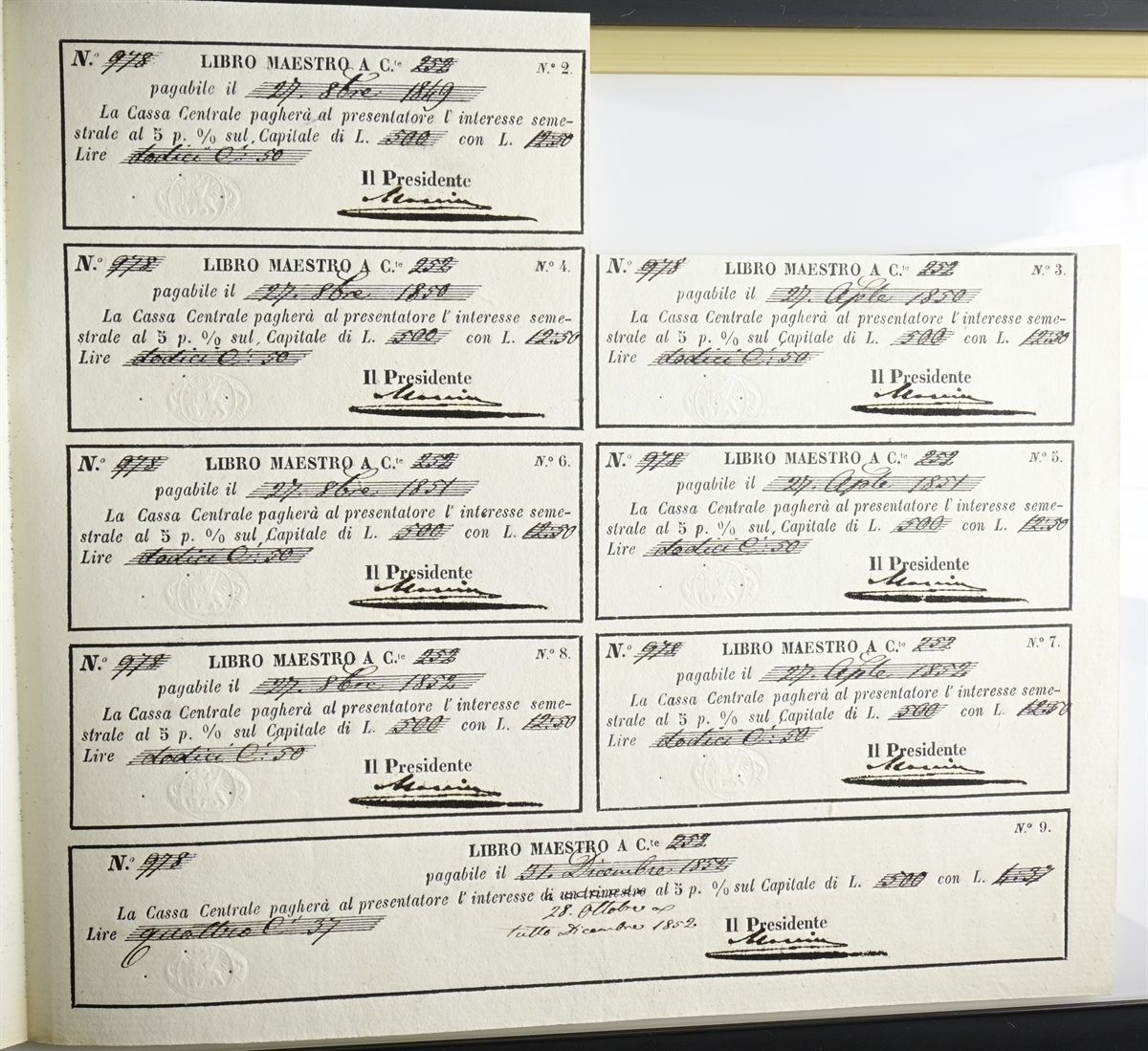 Firme di Manin come Presidente, del Capo Dipartimento delle Finanze e del Direttore emissione cedole.