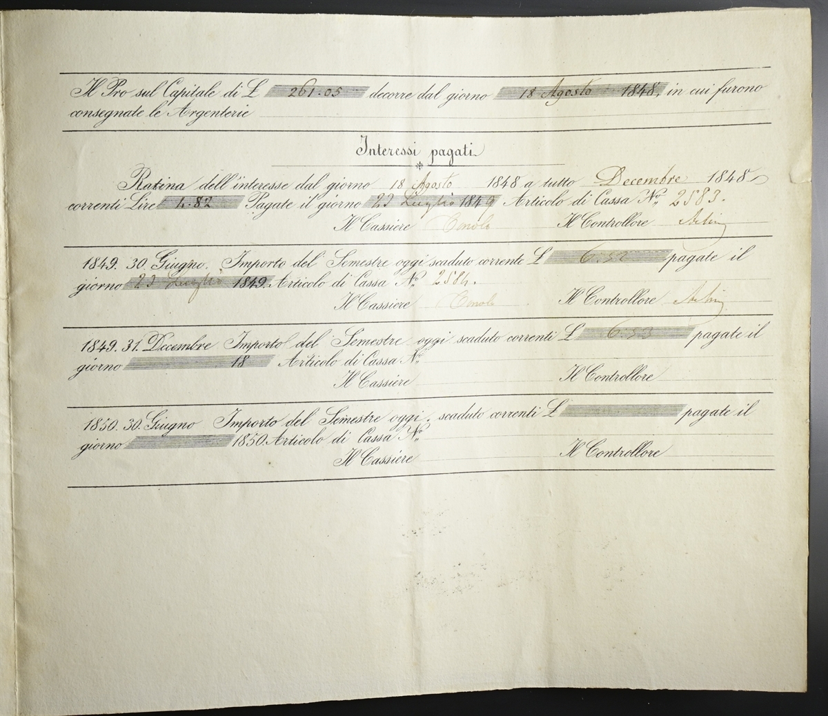 Governo Provvisorio della Repubblica Veneta. Buoni del Prestito, 1848-1849. Buoni del prestito di oggetti preziosi (di Venezia) decreto del 20 agosto 1848, visto 27 dic. 1848.