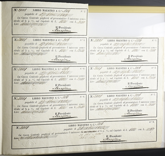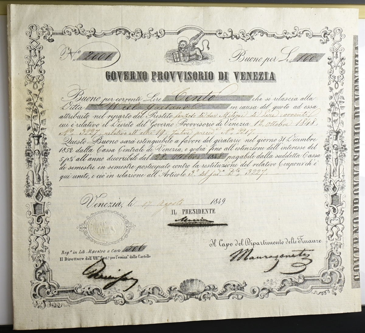 Governo Provvisorio della Repubblica Veneta. Buoni del Prestito, 1848-1849. Buoni del prestito forzoso di tre milioni (di Venezia) decreto n. 3227 del 12 Ottobre 1848. 100 Lire, 17 Agosto 1849.