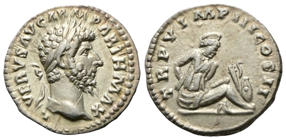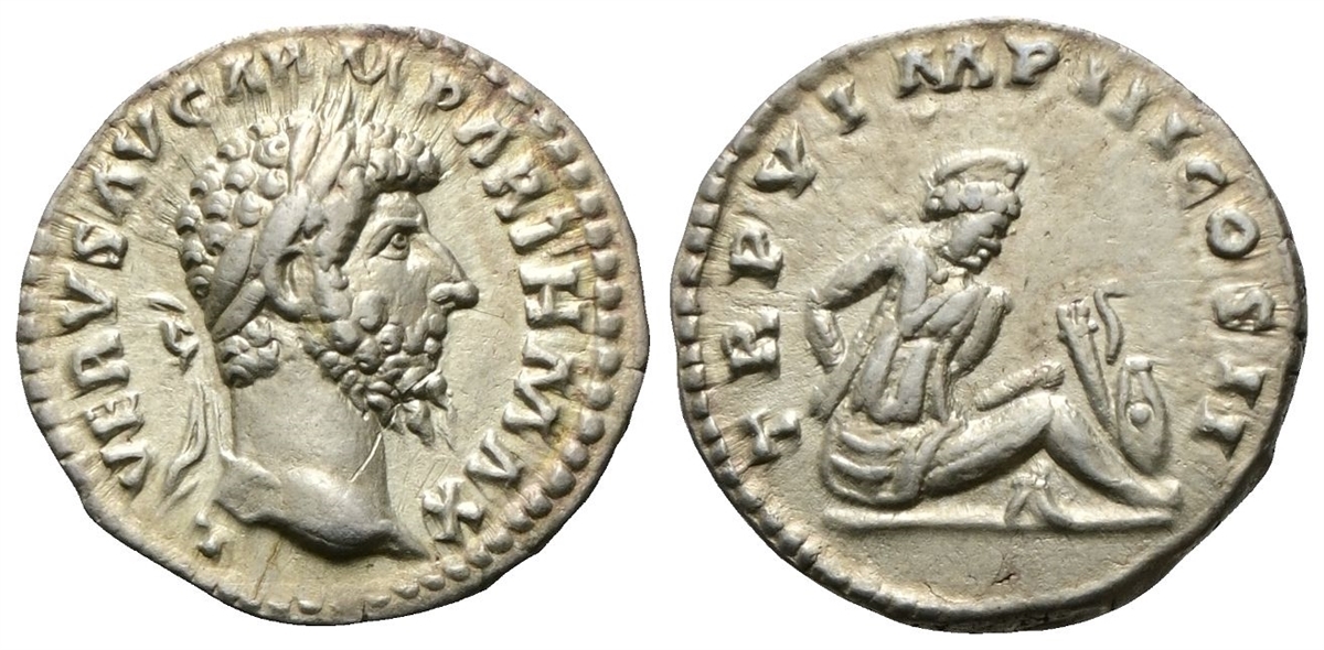 Dr. L - VERVS AVG ARM PARTH MAX. Testa laureata a d. Rv. TR P V IMP III COS II. Prigioniero partico seduto a terra verso d., con berretto a punta e mani legate dietro la schiena; a d., davanti alle gambe, faretra, arco e scudo.