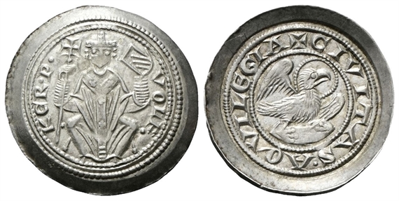 Dr. VOLF • - KER •P•. Il Patriarca mitrato, seduto in faldistorio, tiene nella d. la croce patriarcale e nella s. sollevata un libro chiuso, tutto entro doppio cerchio perlinato. Rv. + CIVITAS •AQVILEGIA. Aquila nimbata, con le ali spiegate, verso d., stringe tra gli artigli un rotolo spiegato.