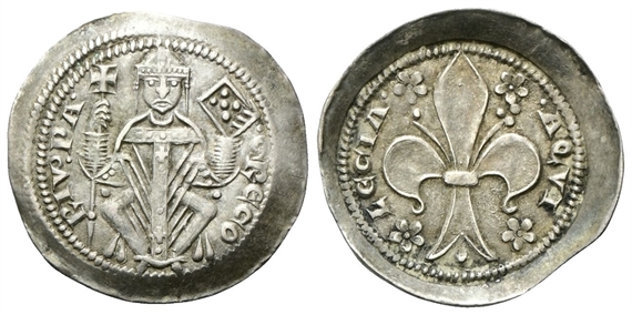 Dr. •GREGO - RIV’. PA•. Il Patriarca mitrato, seduto in faldistorio, regge nella d. la croce patriarcale e nella s. sollevata un libro ornato da 5 borchie. Rv. •AQVI - LEGIA•. Giglio con due trifogli ascendenti dagli angoli superiori, accantonato da quattro rosette a cinque petali.