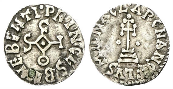 Dr. •PRINCES BENEBENTI. Monogramma. Rv. •ARHANCELVS - MICHACL. Croce su tre gradini tra due globetti.