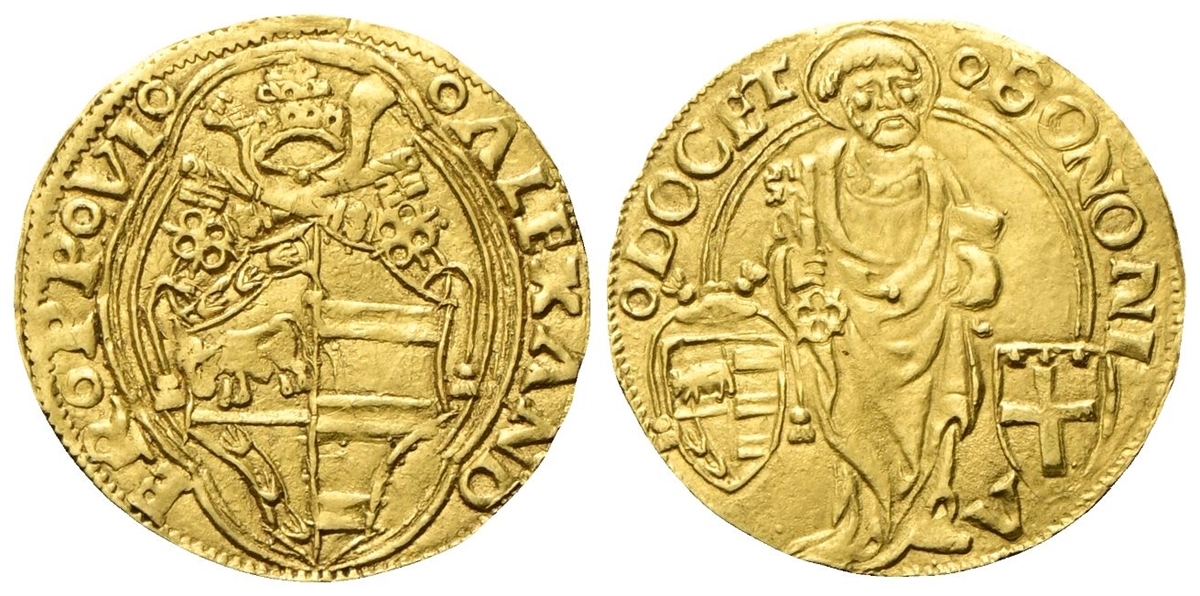 Dr. °ALEXAND - ER° PP °VI°. Stemma decagono del pontefice in quadribolo sormontato da triregno e chiavi decussate. Rv. °BONONI - A - °DOCET. Il Santo stante e frontale; ai lati, stemma Borgia e di Bologna con croce.