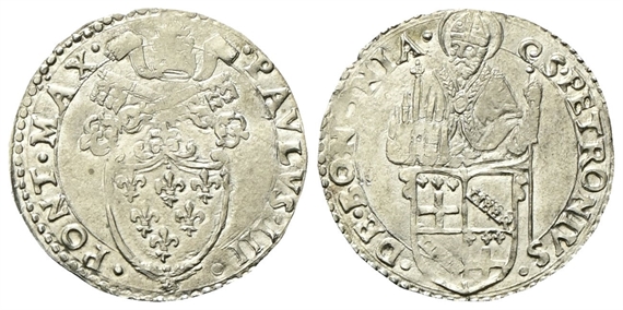 Dr. •PAVLVS• III• - •PONT• MAX•. Stemma semiovale gigliato sormontato da triregno e chiavi decussate. Rv. S• PETRONIVS• - •DE BONONIA •. Busto di San Petronio; sotto, armetta di Bologna.