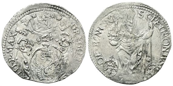 Dr. GREGORIVS - XIII▾ P▾ MAX. Stemma ovale in cornice sormontato da triregno e chiavi decussate tra due rosette. Rv. S - PETRONIVS - DE▾ BONONIA. San Petronio, stante e frontale, regge pastorale e modellino della città; ai lari, armetta Frangipani e armetta della città.