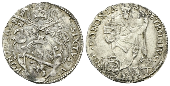 Dr. ★ - SIXTVS▴ V▴ - PONT▴ MAX - ★. Stemma ovale sormontato da triregno e chiavi decussate. Rv.▾ S - PETRONIVS▾ - ▾DE▾ BONONIA▾. Il Santo stante e frontale regge pastorale e modellino della città; ai lati, armetta Caetani e armetta di Bologna.