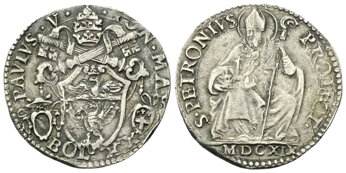 Dr. PAVLVS - •V• - •PON• MAX. Stemma a targa sormontato da triregno e chiavi decussate; ai lati, armetta Capponi, e armetta della città con croce. Rv. S •PETRONIVS - PREOTECT•. Il Santo seduto; in esergo, MDCXIX.
