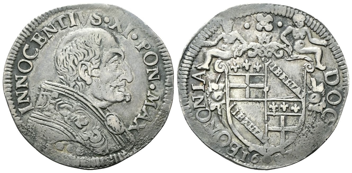 Dr. INNOCENTIVS •XI •PON •MAX. Busto a d., con piviale e mozzetta decorata. Rv. BONONIA - • ✿ • - DOCET. Armetta di Bologna inquartata con due figure sedute sulla cimasa; sotto, I6 - 83.