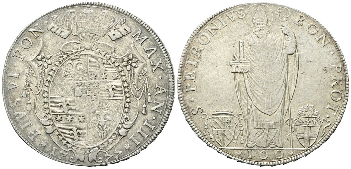 Dr. ✶PIVS •VI •PON• - MAX• AN• III✶. Stemma ovale in cornice sormontato da triregno e chiavi decussate; ai lati, 17 - 77. Rv. S• PETRONIVS - BON• PROT•. San Petronio stante con pastorale e modellino della cità; ai lati, armetta D’Aquino e stemma della città; in esergo, valore.