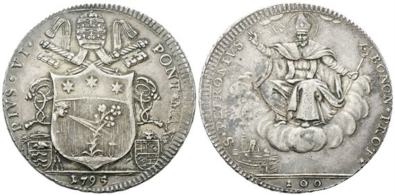 Pio VI (Giannangelo Braschi), 1775-1799. Scudo da 100 Bolognini 1795 (data corretta su 1784).