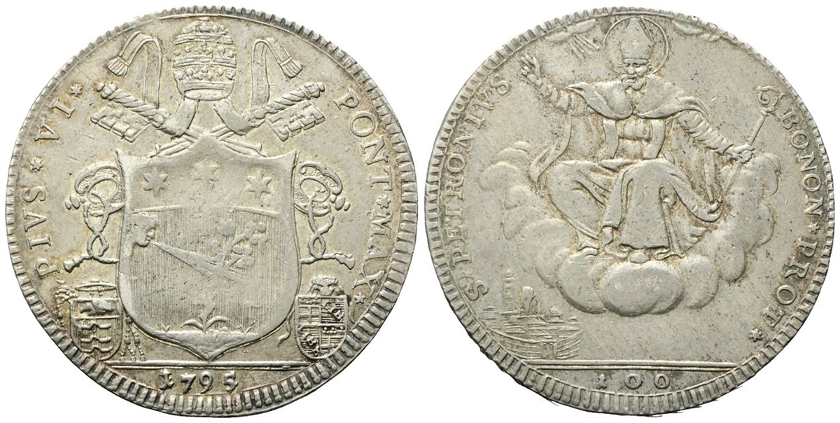 Pio VI (Giannangelo Braschi), 1775-1799. Scudo da 100 Bolognini 1795 (data corretta su 1784)