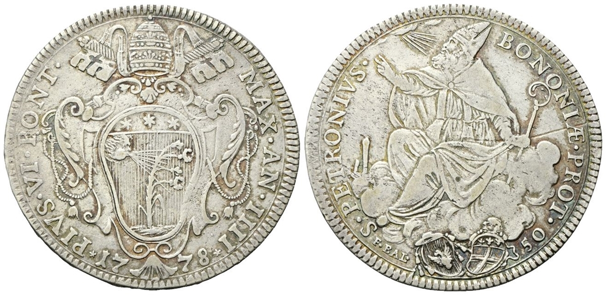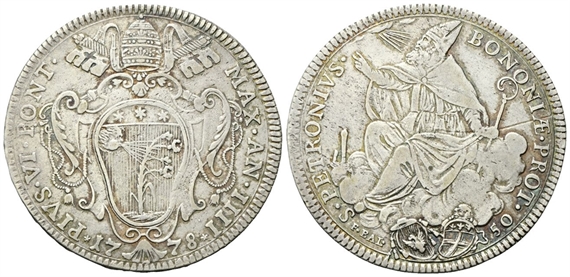 Dr. ★PIVS• VI• PON• - MAX• AN•IIII★. Stemma ovale in cornice sormontato da triregno e chiavi decussate. Rv. S PETRONIVS • - BONONIAE PROT•. San Petronio seduto verso s. su nubi; a s., le due torri; sotto, armetta Boncompagni e armetta di Bologna su croce.