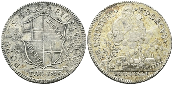 Dr. POPVLVS • ET • - SENATVS : BONON •. Stemma sormontato da testa leonina tra due rami di lauro; in esergo, 1796. Rv. PRAESIDIVM ✶- ✶ET✶ DECVS✶. La B.V. con il Figlio sulle nubi; sotto, veduta della città di Bologna con grande albero a s.; in esergo, BON • DOCET•.