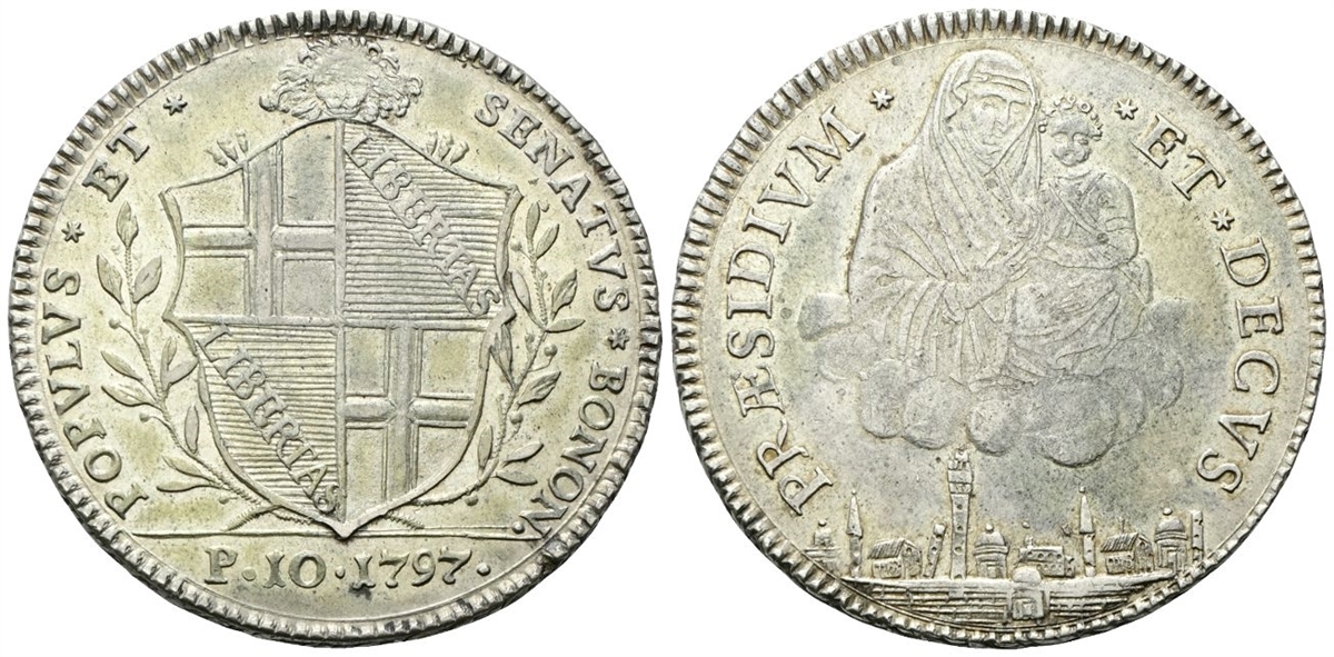 Dr. POPVLVS✶ ET✶ - SENATVS✶ BONON. Stemma sormontato da testa leonina tra due rami di lauro; in esergo, 1797. Rv. PRAESIDIVM ✶- ✶ET DECVS. La B.V. con il Figlio sulle nubi; sotto, veduta della città.