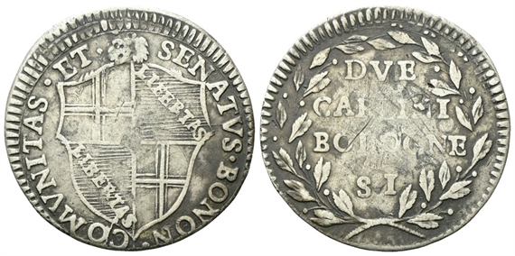Dr. COMVNITAS• ET• - SENATVS• BONON•. Stemma inquartato della città sormontato da maschera leonina. Rv. DVE / CARLINI / BOLOGNE / SI. Iscrizione entro corona di foglie d’alloro.