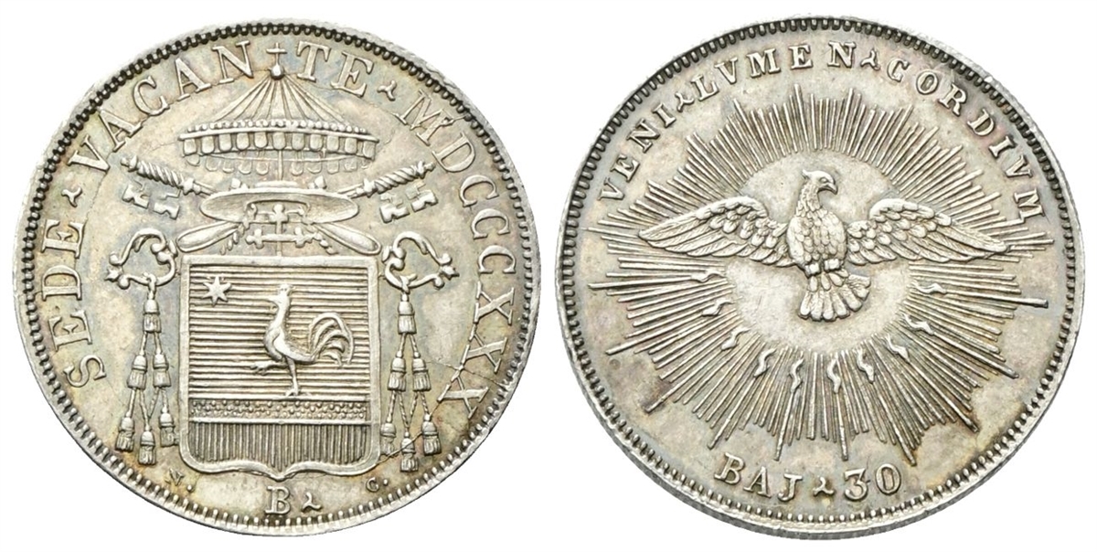 Dr. SEDE▴ VACAN - TE▴ MDCCCXXX. Stemma sormontato da galero, chiavi decussate, padiglione e colomba. Rv. VENI ▴LVMEN ▴CORDIVM. Colomba raggiante in volo.