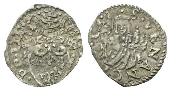 Dr. PA[VLVS] - •PP• III•. Stemma semiovale gigliato. Rv. •S• VENANCI[VS]• CA•. Mezzobusto del Santo frontale, con vessillo nella d. e la Città nella s.