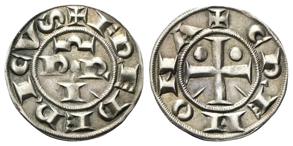 Dr. + FREDERICVS. Le lettere P R I disposte attorno a globetto. Rv. + CREMONA. Croce; nel 1° e 2° quarto, un globetto; nel 3°e 4°quarto, cuneo.
