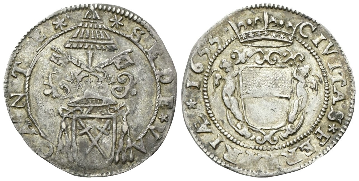 Dr. ✶SEDE✶ VA - CANTE✶. Stemma cardinalizio semiovale, con croce arcivescovile e cappello sormontato da chiavi decussate e padiglione. Rv. CIVITAS ★FERRARIÆ★ 1655★. Stemma a targa semiovale; ai lati, due figure addossate allo scudo.