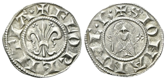 Dr. + FLORENTIA✶. Giglio. Rv. + •S•’ IOHANNE• B•. Mezza figura di fronte di S. Giovanni con nimbo perlato, benedicente e con lunga croce astile.