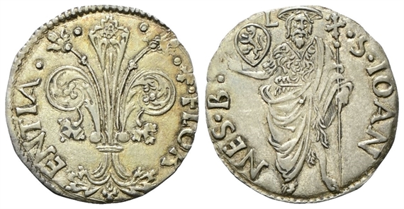 Dr. •✤•FLOR - ENTIA• - • - •. Giglio con due fiori. Rv. •S• IOAN - NES •B• (segno: stemma Davanzati sormontato da L). San Giovanni, nimbato, stante e frontale, con una lunga croce appoggiata alla spalla s., nell’atto di benedire.
