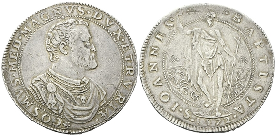 Dr. ✶COSMVS •MED• MAGNVS• DVX• ETRVRIAE•. Busto a d. drappeggiato e corazzato con testa nuda; sul petto, maschera di Pan. Rv. •S• IOANNES• - •BAPTISTA•. Il Santo stante e frontale, con la d. alzata e con lunga croce nella s., in atto di predicare.
