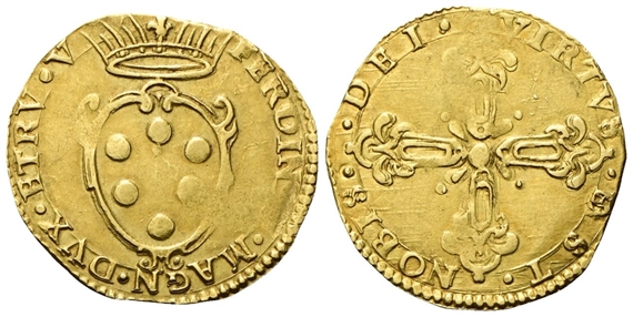 Dr. FERDIN •[II] •MAGN •DVX •ETRV• V. Stemma semiovale sormontato dalla corona granducale. Rv. VIRTVS - • EST• - NOBIS• - DEI•. Croce incava ornata e accantonata al centro da quattro losanghette sormantate da globetto.