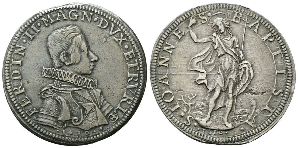 Dr. FERDIN• II• MAGN• DVX• ETRVRIAE. Busto corazzato e paludato a d. con vistoso collare alla spgnola; sull’armatura, decori a girali; sotto, nel giro, tra due stelle, 1630. Rv. •S• IOANNE - S• - B - APTISTA•. San Giovanni stante in atto di predicazione; attorno, piccoli arbusti; sotto 163(rovesciato)0.