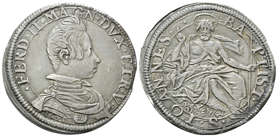 Dr. •FERD• II• MAGN• DVX• ETR• V•. Busto giovanile corazzato a d.; sotto, nel giro, 1621. Rv. •S• IOANNES • - • - •BA - PTIST•. San Giovanni seduto di fronte su roccia, benedicente, regge nella s. una lunga croce astile.