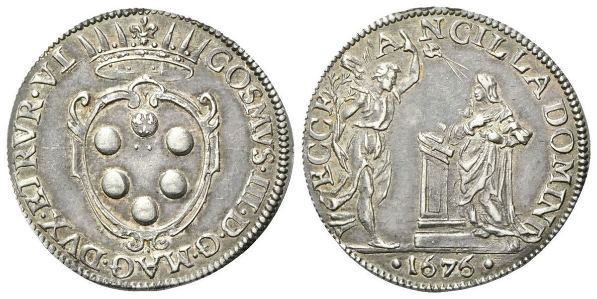Dr. COSMVS• III• D• G• MAG• DVX• ETRVR• VI. Stemma coronato. Rv. ECCE - A - NCILLA DOMINI. L’Annunciazione della Beata Vergine; in esergo, 1676.