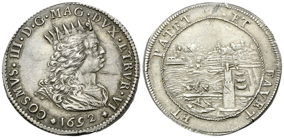 Dr. ✤COSMVS• III • D• G • MAG • DVX• ETRVR • VI✤. Busto radiato, drappeggiato e corazzato a d.; sotto, nel giro, 1692. Rv. ET - PATET - ET - FAVET. Veduta del porto di Livorno con la fortezza e navi alla fonda.