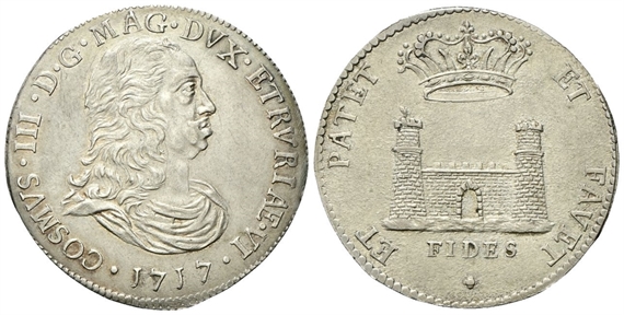 Dr. •COSMVS• III• D• G• MAG• DVX• ETVRIAE• IV• 1717•. Busto a d., coronato con lunga capigliatura. Rv. ✤ET PATET - ET FAVET. Veduta del porto di Livorno con il faro in primo piano; sotto, FIDES.