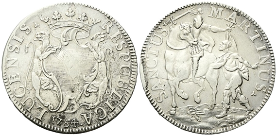 Dr. RESPVBLICA - LVCENSIS (trifoglio). Stemma in cartella coronato, tra due pantere, con banda iscritta LIBERTAS. Rv. SANCTUS - MARTINUS (trifoglio). Il Santo a cavallo taglia il mantello da donare al mendicante.