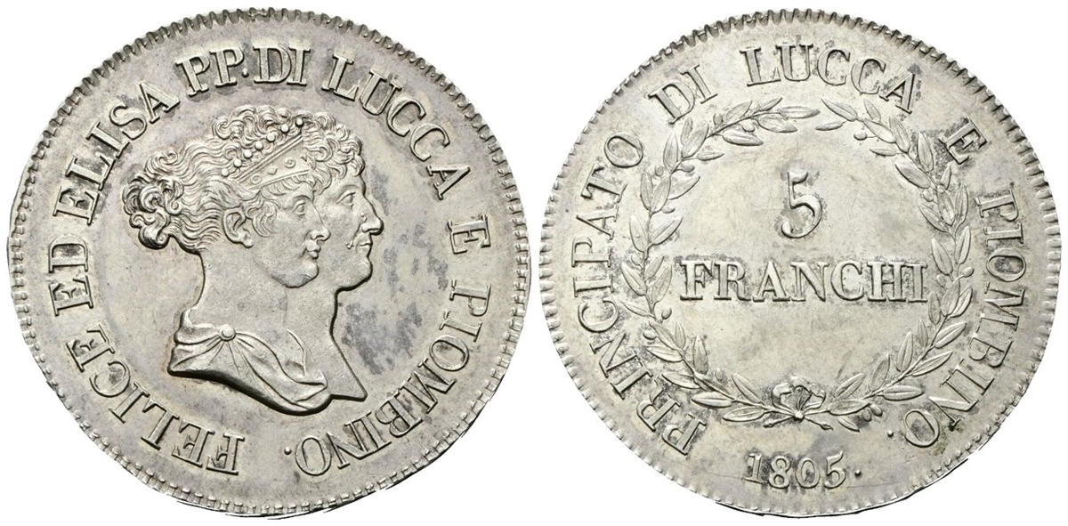 Felice e Elisa Baciocchi, 1805-1814. 5 Franchi 1805 busti piccoli.