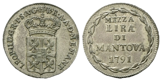 Dr. LEOP• II •D •G •R •I •S• A• G• H• B• R• A• A• D• M• E• MANT•. Stemma coronato. Rv. MEZZA / LIRA / DI / MANTOVA / 1791. Iscrizione disposta su cinque righe entro corona di foglie di alloro.