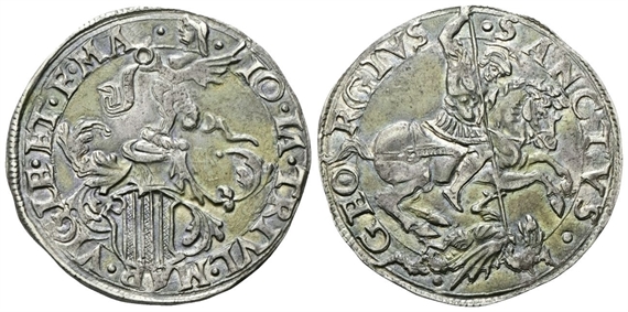 Dr. • - IO• IA• TRIVL• MAR •VIGLE• ET• F •MA - •. Stemma sormontato da elmo con cimiero. Rv. •SANCTVS• - • - GEO - RGIVS. San Giorgio a cavallo trafigge il drago.