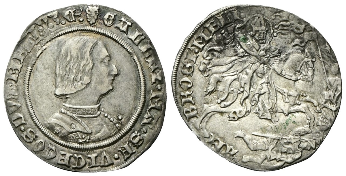 Dr. (biscia) GALEAZ• MA•SF• VICECOS• DVX •MLI• V•3•C•. Busto corazzato a d.; ritratto di secondo tipo. Rv. S - AM - BROSI• MELI•. Sant’Ambrogio al galoppo a d. con lo staffile mentre colpisce e travolge guerrieri armati di scudi, lance e spade; sotto al cavallo, un guerriero armato di spada.