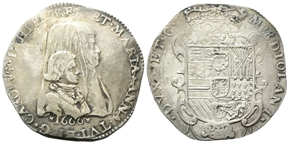 Dr. CAROLVS• II• HISP •REX• ET• MARIA• ANNA• TVT• ET• G✶. Busti accollati a d., sotto, 1666. Rv. MEDIOLANI✶ - ✶DVX✶ ET✶ C✶. Stemma spagnolo coronato.
