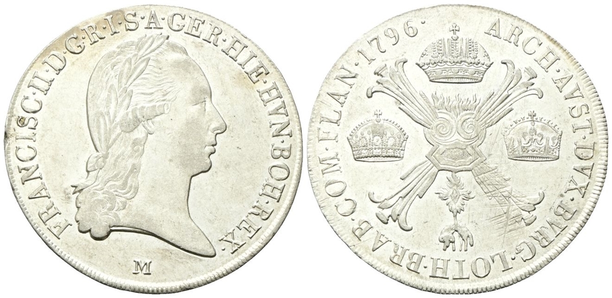 Dr. FRANCISC•II•D•G•R•I•S•A•GER•HIE•HVN•BOH•REX•. Testa laureata a d. Rv. ARCH•AVST•DVX•BVRG•LOTH•BRAB•COM•FLAN •1796•. Croce di Borgogna, col Toson d'oro, accantonata dalle corone d'Austria, Ungheria e Boemia.