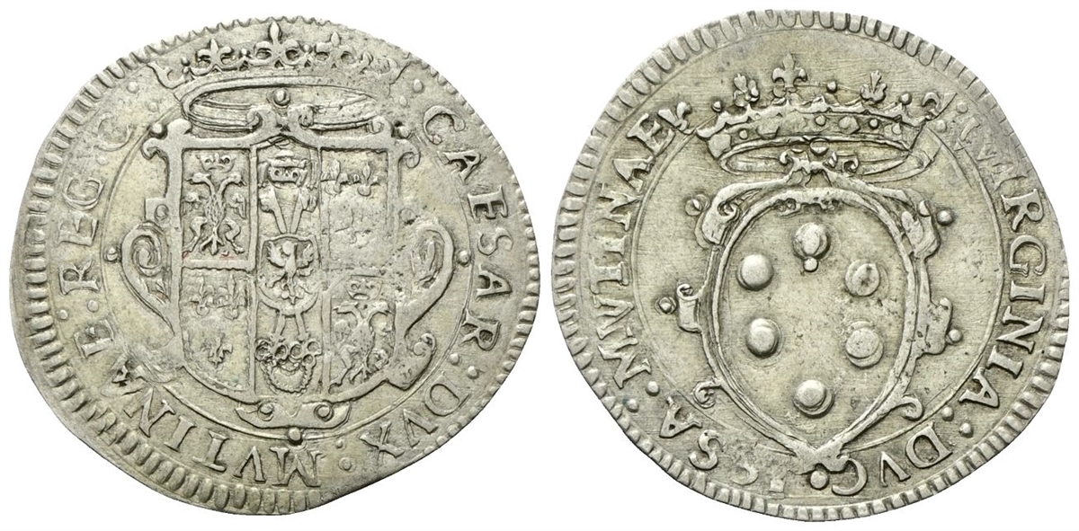 Dr. CAESAR: DVX :MVTINAE: REG: C:. Stemma coronato. Rv. VIRGINIA: DVC - ISSA : MVTINAE. Stemma Medici coronato.