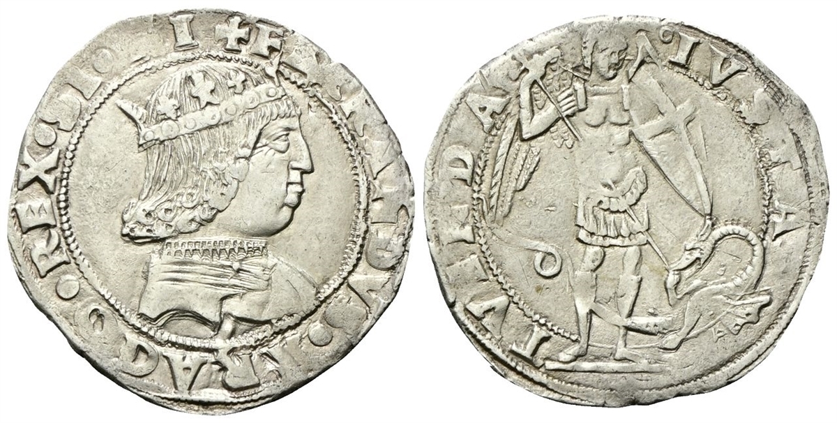 Dr. +FERRANDVS•ARAGO•REX•SI•HI. Busto coronato a d. Rv. °IVSTA - TVENDA. L’Arcangelo Michele stante e frontale con uno scudo circolare nella mano s. ed una lancia nella mano d., nell’atto di trafiggere un drago.