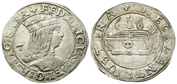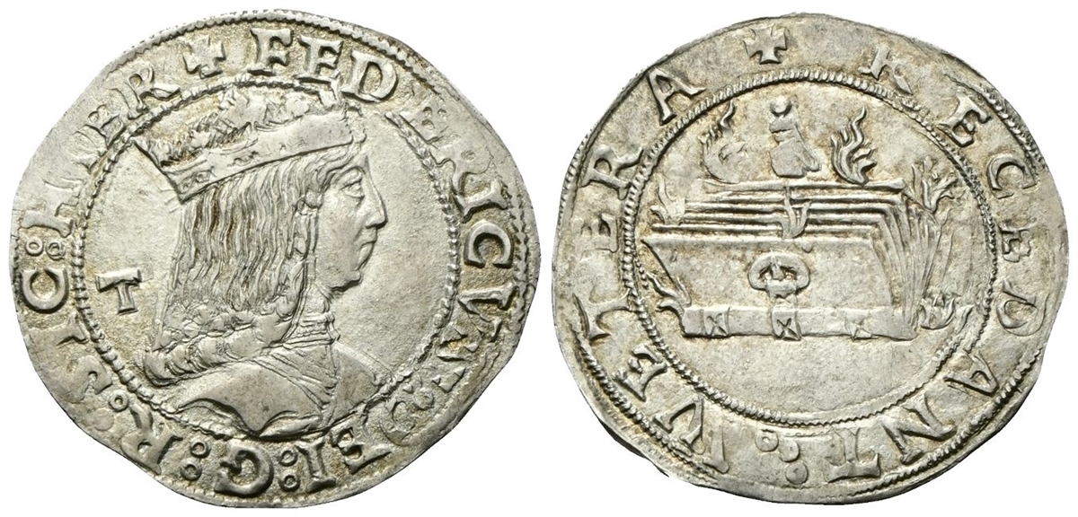 Dr. +FEDERICVS: DEI: G: R :SIC: HIER. Busto coronato a d. con lunghi capelli del re; dietro, lettera T. Rv. + °RECEDANT :VETERA°. Libro tra fiamme.