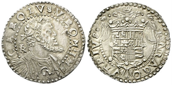 Dr. CAROLVS •V• ROM• IM. Busto laureato, corazzato a d.; dietro la nuca; sigla IBR. Rv. R •ARAGO - VTRIVS•. Stemma inquartato, caricato da aquila bicipite; tra le due teste corona.