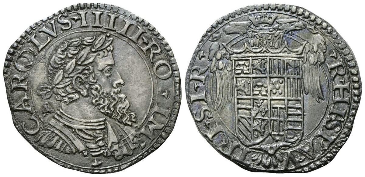 Dr. CAROLVS ▾IIIII▾ RO▾ IM ▾ -▾. Busto laureato e corazzato a d.; dietro la nuca, A. Rv. ▾R▾ HISPA ▾ V - TRI ▾SI ▾R ▾. Stemma inquartato coronato su aquila bicipite.