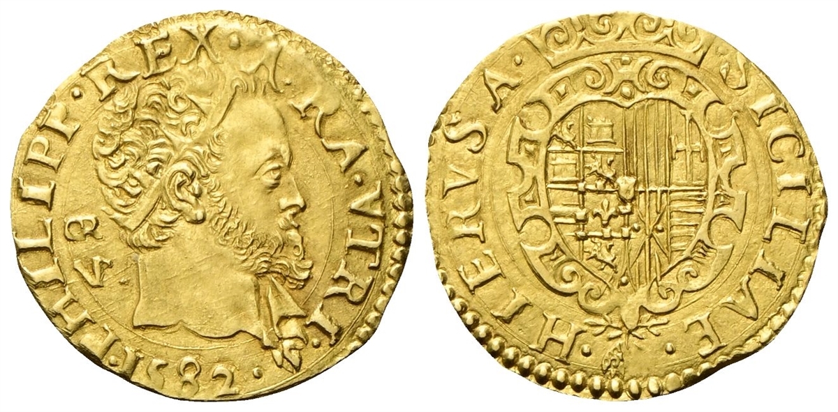 Dr. PHILIPP •REX• ARA• VTRI•. Testa radiata a d.; dietro la nuca, GR/VP Rv. • SICILIAE • - • HIERVSA•. Stemma a cuore, inquartato, coronato.