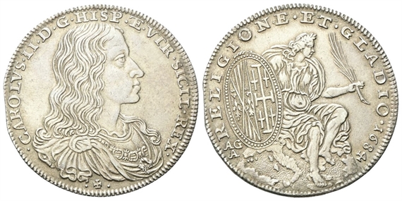 Dr. •CAROLVS• II• D •G •HISP• ET• VTR• SICIL• REX•. Busto corazzato a d.; sotto, croce greca. Rv. RELIGIONE• ET •GLADIO•. La Vittoria seduta su globo volto a d.: con la mano d. tiene stemma ovale bipartito, mentre con la s. un ramo di palma; a s., le sigle AG/A.