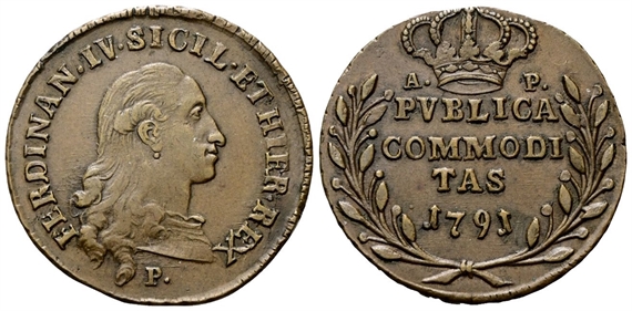 Dr. FERDINAN• IV• SICIL• ET• HIER• REX. Busto a d. Rv. PVBBLICA / COMMODI / TAS / 1791. Iscrizione disposta su tre righe; sopra, corona.