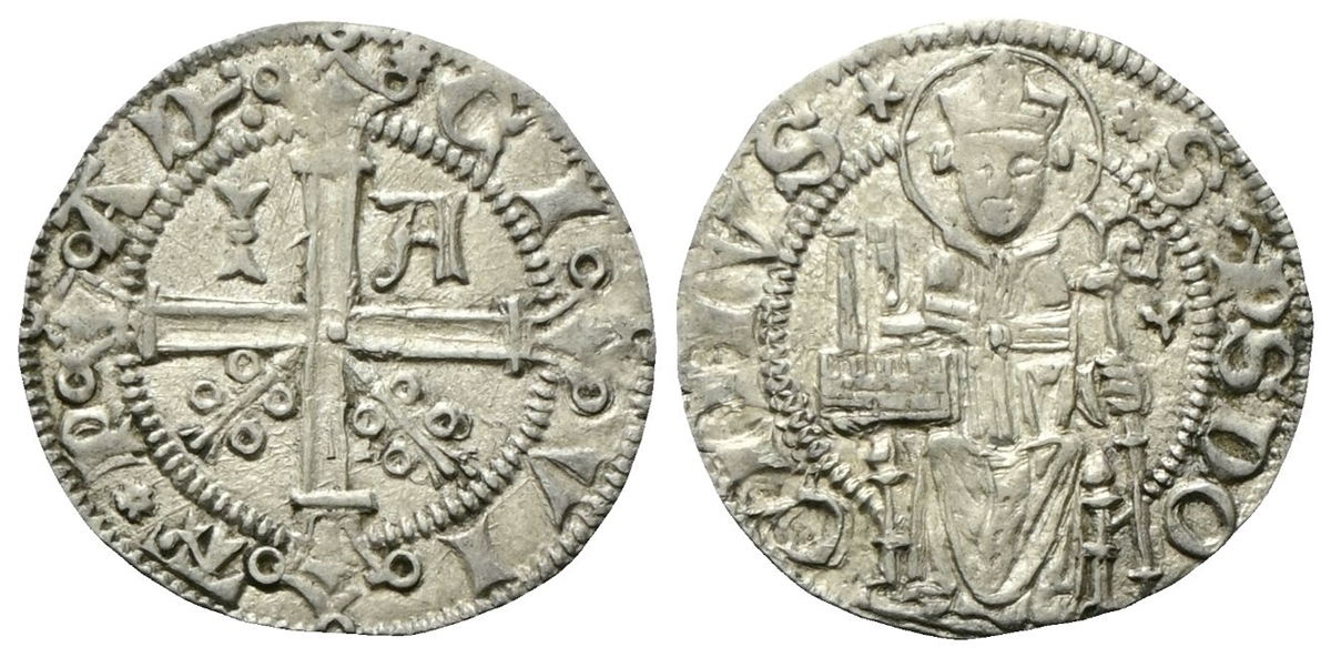 Dr. ✿C I - VI - T ✿ - P - AD’•. Croce filettata e ornata alle estremità; nei quarti superiori, I - A; nei quarti inferiori, carri. Rv. ✿S✿ PSDO - CIHVS★. Il Santo nimbato e mitrato, seduto di prospetto, tiene nella d. un edificio turrito e nella s. il pastorale; a d., trifoglio stlizzato.