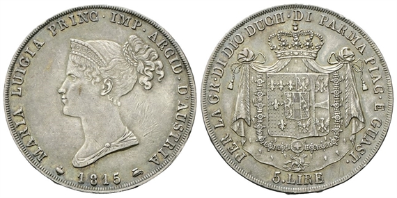 Dr. MARIA LUIGIA PRINC• IMP ARCID. D’AUSTRIA. Busto diademato a s. Rv. PER LA GR• DI DIO DUCH•DI PARMA PIAC•E GUAST. Stemma coronato su padiglione entro cerchio; sotto, 5•LIRE.